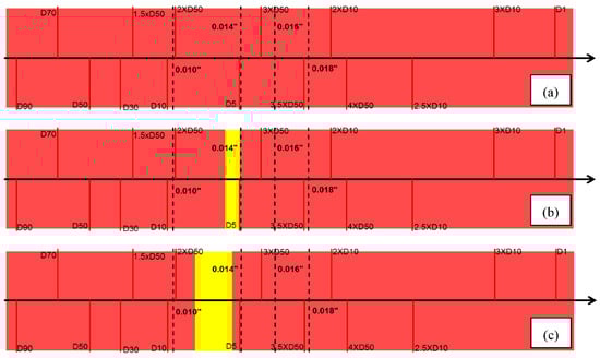 Produced sand results for DC-II using slot apertures of (a) 0.010′′, (b) 0.014′′, and (c) (0.016′′) 0.018′′.