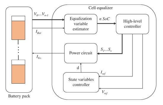Typically, an EV battery pack consists of a cluster of cells, where each Li-ion cell is not exactly equal to the others in terms of capacity, internal resistance and self-discharge rate because of normal dispersion during manufacturing. These characteristics cause a different charge/discharge time for each cell, which can lead to the undercharge, overcharge or over-discharge on some cells if the battery pack is operated without protection [,]. In these states, the cell loses capacity and can explode; consequently, avoiding them is desirable. The most viable solution for this problem is not found by modifying the chemistry of the battery, but it is found in the electronic industry. Hence, the battery pack is equipped with cell equalizers to avoid the states mentioned above [,,].