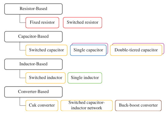 The power circuit is an important subsystem to achieve cell equalization. Many equalization circuits have been presented in the literature, as shown in Figure 2 [,]. BECs present the electronics to extract energy from one cell and to transfer that energy to another cell. A high-level controller uses that function to keep the SOC homogeneous across the battery bank. BECs are categorized in a passive or active equalizer depending on if it dissipates energy [,]. Moreover, based on the main element of the BEC, BECs are classified as depicted in Figure 2. The frame color of the box indicates the possible transfers of energy. Table 1 explains the color code used in Figure 2.