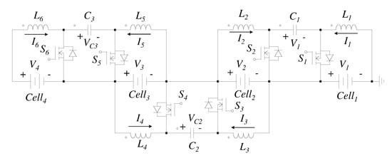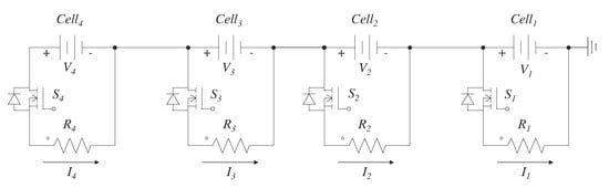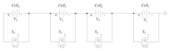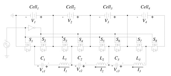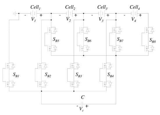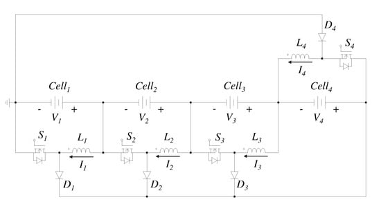 A BEC is essentially a power electronic controller, which takes active measures to equalize the voltage or the state of charge (SOC) in each cell [,,]. As a result, each of the cells has the same SOC during charging and discharging, even in conditions of high dispersion in capacity and internal resistance. If all the cells have the same SOC utilization, they degrade equally at the average degradation of the pack. If this condition is accomplished, then all cells have the same capacity during the whole lifetime of the battery pack, avoiding premature end of life due to the end of life of only one cell [,,]. A diagram of these devices is presented in Figure 1.