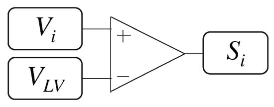 Passive BECs keep the operating voltage of the cells by burning the excess of energy. Figure 3 shows the switched resistor topology. It can be appreciated that these equalizers present a switch and a resistor for each cell. In this scheme, the metal–oxide–semiconductor field-effect transistor (MOSFET) controls the amount of energy burned. The resistor transforms energy into heat when the MOSFET is on. The switch is on until the cell reaches the lowest voltage in the pack. Therefore, avoiding damaged cells is crucial to prevent an excess of wasted energy. These equalizers present a low efficiency since the goal is to burn energy. Moreover, they require a thermal management system [,,]. Figure 4 shows the control circuit required for this scheme, where is the voltage of the ith cell of the battery pack, is the lowest voltage cell in the battery pack, and is the control signal of the ith MOSFET.