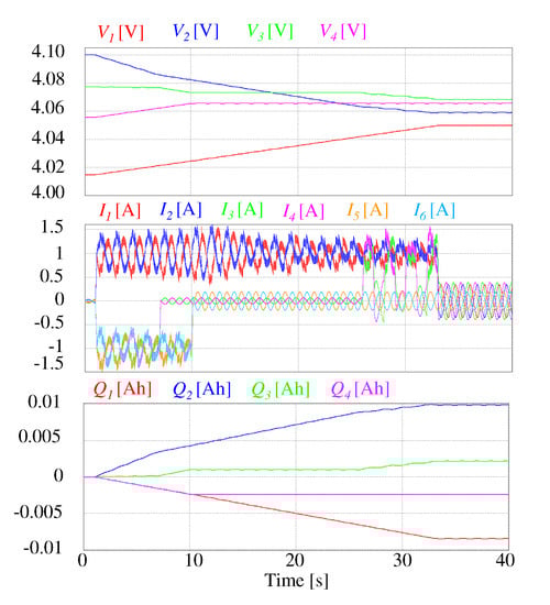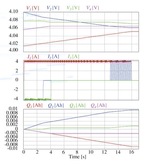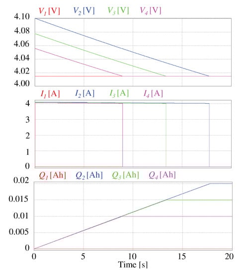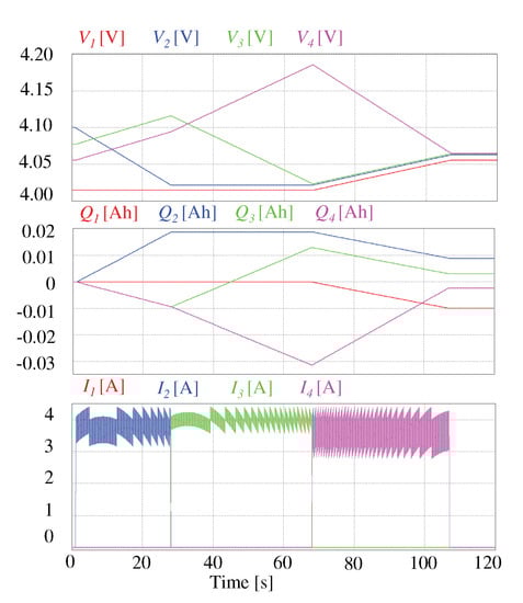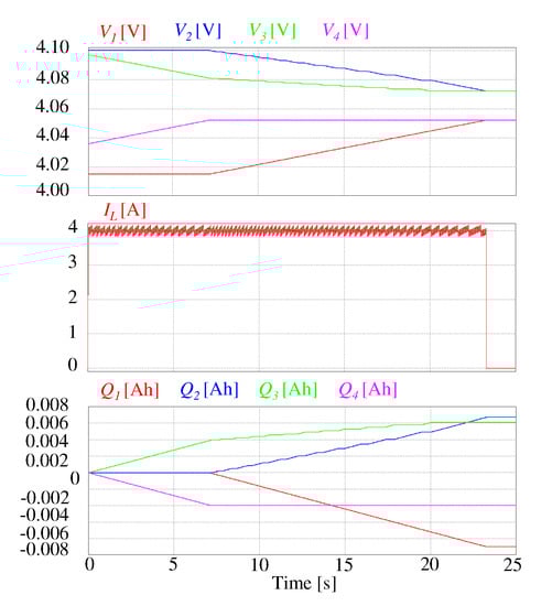Figure 23 shows the simulation for a four-cell battery bank with the single inductor scheme. delivers energy to , while and remain untouched. This behavior is explained because they are within an allowable range with the average voltage of the pack. Moreover, it reflects an advantage of the topologies that only use one storage device since direct C2C transfer is used for the initial conditions of the battery. Hence, in case that the battery bank is completely equalized except for two physically distant cells, topologies with one storage device perform better than other schemes (lower equalization time and better efficiency) if a direct C2C is implemented. Figure 24 shows a simulation where more than one transfer is required. In this case, the topology does not perform well, since it is handled one transfer at a time. For this simulation, an inductor of 500 F was used, leading to a ripple of 0.4 A. Table 4 shows a comparison of the inductor-based equalizers.