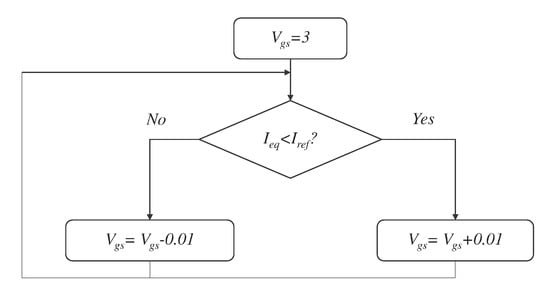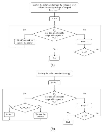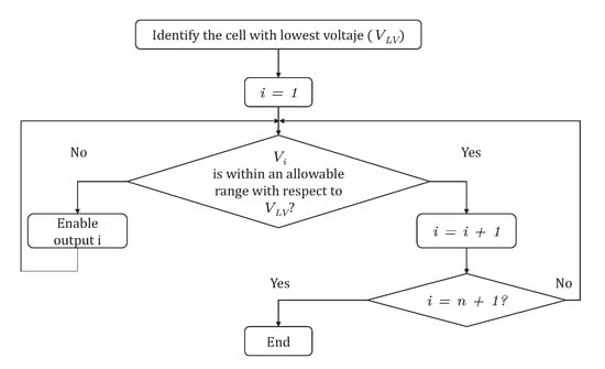 Reference [] presents the shunt switch scheme for passive equalization. Previous works have used this topology [,]. However, in [], the MOSFET is used as a voltage-dependent current source achieving a very flexible topology. Figure 6 shows the shunt switch scheme. This scheme only presents one MOSFET per cell. The operating principle is the same as the switched resistor topology; the energy is extracted from each cell and transformed into heat until all cells equal the lowest SOC cell. However, this topology eliminates the resistor and is obtained a reduced component count circuit. Nevertheless, the complexity of the controller required in this scheme is greater than the required in the switched resistor topology. Moreover, the MOSFET must operate in the ohmic region. The desired equalization current is controlled with the voltage gate-source of the MOSFET. Figure 7 shows the algorithm to achieve the desired behavior in the MOSFET. As in the previous topology, avoiding damaged cells in the battery bank is imperative, and the efficiency is a demerit of this scheme. However, it does not require a large thermal management system since the flange of the MOSFET is used.