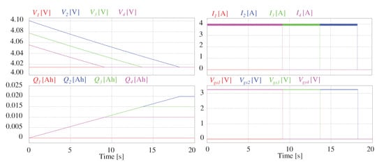 Figure 5 shows the simulation of the equalization process of a four-cell battery bank using the switched resistor topology. The resistance presents a value of 1 , leading to a current numerically equal to the voltage of the cell (2.7–4.2 A). The maximum power dissipation required is the square of the maximum current (17.64 W). It can be appreciated that the energy burned is 200 mAh, 150 mAh and 100 mAh in cells 2–4, respectively. The equalization time depends on the amount of energy required to burn and the voltage of the cell. Equation (1) describes the behavior of the equalization time in this scheme, where is the equalization time, is the excess of energy in one cell compared to the cell with the lowest SOC and is the equalization current. Hence, the equalization time is inversely proportional to the voltage of the cell. Moreover, activating the equalization process when the cells present the highest possible voltage is desirable. The excess energy is always related to the cell with lower SOC; hence, avoiding a damaged cell is imperative since it will lead to excessive energy waste.