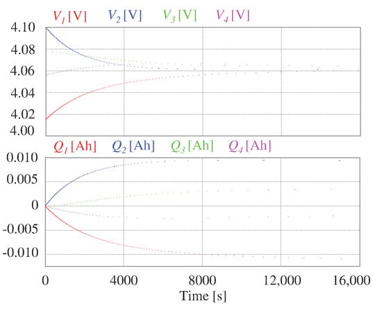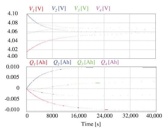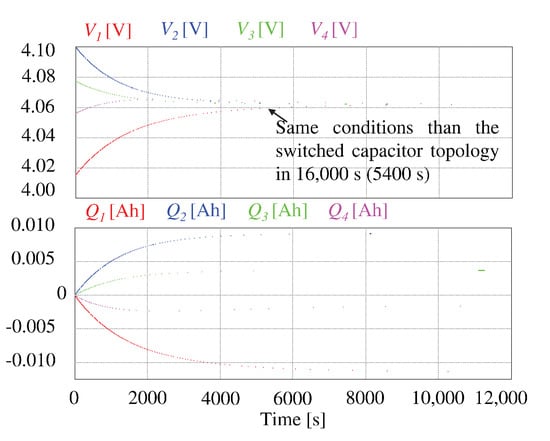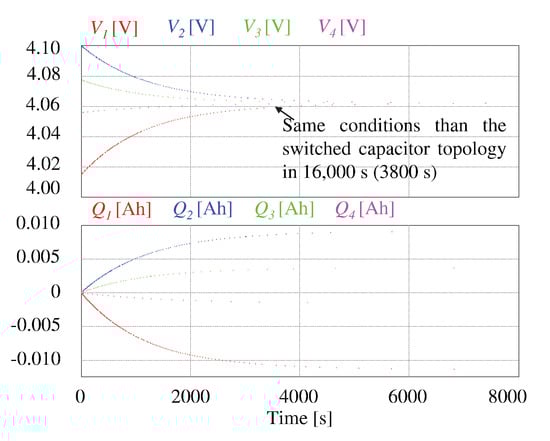 Figure 14 shows the simulation for the single capacitor equalizer. It is appreciated that the equalization time increases up to 28,000 s (more than seven hours). This increase is because it presents the same characteristics as the previous topology, and only one capacitor to handle all the transfers needed. Therefore, it requires 20,000 s more than the switched capacitor scheme. In general, the single capacitor equalizer presents poor characteristics when compared to the switched capacitor. An advantage is using only one capacitor, and the efficiency is slightly superior because it eliminates redundant transfers of energy. Moreover, it allows direct cell-to-cell transfers, but it requires a complex controller to take advantage of that feature. This circuit only presents one capacitor but requires one voltage sensor for each cell, double the MOSFETs, and a controller to make decisions.