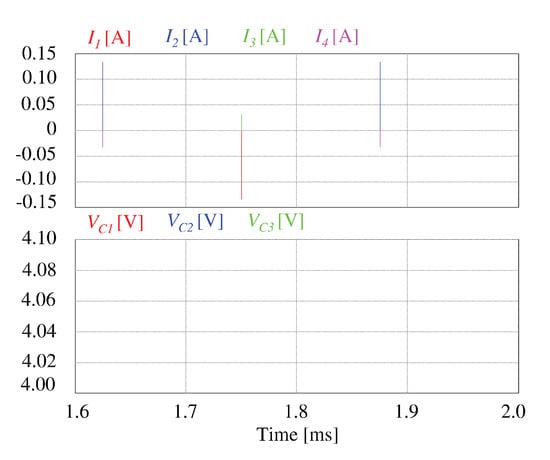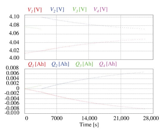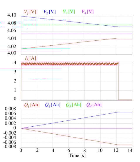 Figure 10 shows the simulation for the switched capacitor circuit. It takes 8000 s (more than two hours) to equalize the cells within a range of 10 mV. Moreover, the signal keeps equalizing the cells, and at 16,000 s, all cells are within a hysteresis of 0.004 V. The extensive equalization time is because the current is not controlled, and after a peak in the current, it decreases to zero. Furthermore, the closer the cell voltages get, the lower the peak current became. However, this behavior leads to the controller’s simplicity since it does not require a stop condition. Figure 11 depicts a zoom in the variables of interest in the circuit. It shows the behavior of the current and its dependence on the difference in voltage between adjacent cells. It also shows that the MOSFETs switch the state after the current became zero to maximize the energy transfer and decrease the switching losses. As a demerit, it presents redundant transfers of energy, as exemplified in the transfer between and . In the beginning, ; therefore, delivers energy to . However, in a later stage, the direction of the transfer of energy is reverted. Hence, the process is redundant, and that impacts negatively on the efficiency.
