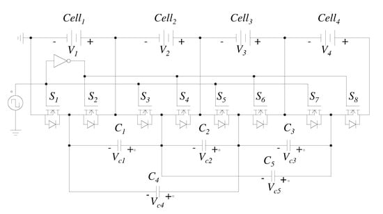 Figure 15 shows the double-tiered capacitor equalizer. This scheme is very similar to the switched capacitor; however, a second layer of capacitors is added to speed up the process in this circuit. It presents the same operating principle; hence, the only controller required is a PWM signal. The current is not controlled, and it cannot be avoided a peak current in the switch of the MOSFET. It also presents redundant transfers of energy as the switched capacitor equalizer [].