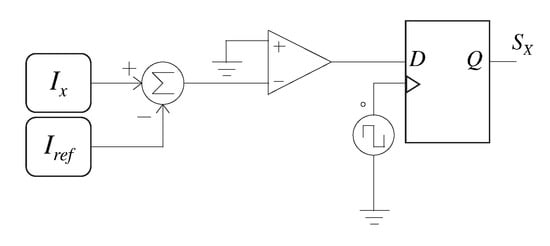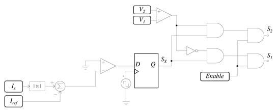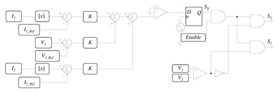 Figure 19 depicts the switched inductor equalizer. This scheme transfer energy between adjacent cells. For this purpose, it requires two MOSFETs and one inductor for every pair of neighboring cells. The MOSFETs allow the transfer of energy in any direction. However, it is necessary to act on the appropriate switch depending on the voltage of each cell. For example, if the voltage in is greater than the voltage in , the controller signal must be applied to switch , while switch must be off all the time. Hence, when the switch is turned off, the current flows through the antiparallel diode of switch to charge . In the controller, it is necessary to obtain the measured current modulus to compare it with the reference. Figure 20 shows the controller with the proper modifications for this scheme. Moreover, a high-level controller is required to handle the stop condition (Enable signal in Figure 20). The stop condition depends on the resolution of the sensor [,,].