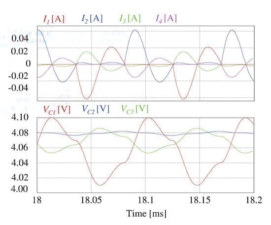 Moreover, the factor is very important since it affects the speed of the system. The current becomes zero after approximately . After that time, the switch changes its state. In this way, the maximum energy is transferred, and the switching losses are neglected []. This work used a capacitor of 47 F, a resistance of 0.5 to emulate the series resistance of the current path and a switching frequency of 4 kHz.