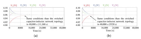 Figure 16 shows the simulation for the double-tiered capacitor equalizer. The equalization process takes 12,000 s (more than three hours). The decrease in the equalization time is due to the second layer of capacitors. It is a good value for the capacitors added since the equalization time is decreased a when compared to the switched capacitor architecture. Moreover, despite the literature not mentioning it, the same principle can be applied to add more layers of capacitors. In this way, the equalization time is reduced even further. Figure 17 shows a test for a triple-tiered capacitor equalizer. In this case, the mark of 0.04 V is achieved faster (3800 s). Therefore, the designer can decide the use of more layers of capacitors to decrease the equalization time. However, in the triple-tiered switched capacitor scheme, the equalization time is decreased by a compared to the double-tiered capacitor equalizer. It can be added layers of capacitors while these elements handle the stress. Table 3 shows a comparison of the capacitor-based equalizers.