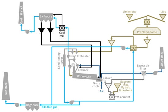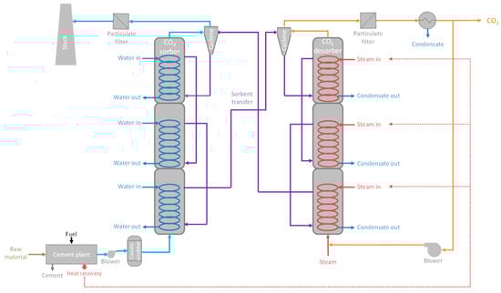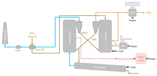 Simplified diagram flow of a CaL process installed in a cement plant: integrated configuration (adapted from [46]).