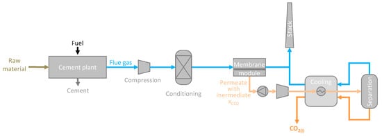 Simplified flow diagram of the pilot membrane unit tested at Brevik cement plant (adapted from [51]).