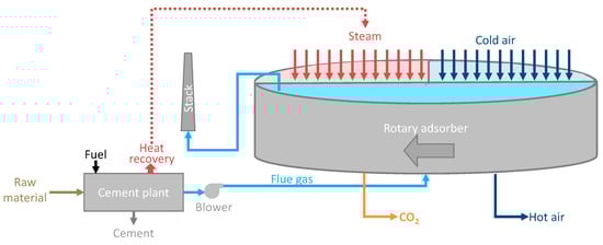 Adsorption-based technology might be close to commercial scale demonstration in the cement sector: in January 2020, Svante (formerly Inventys), LafargeHolcim, Oxy Low Carbon Ventures, and Total, launched a joint study to assess the viability and design of a commercial-scale carbon capture facility at the LafargeHolcim’s Portland Cement Plant in Florence, Colorado, United States of America [57]. This initial scoping study was successfully completed in June 2020, and in September 2020 the United States Department of Energy’s National Energy Technology Laboratory (DOE-NETL) awarded $1.5 million of federal funding to support the advancement of the LH CO2MENT Colorado Project. This would be the largest demonstration in the cement sector, with a capacity of up to 2 Mt of CO2 captured annually [58]. The carbon capture facility would employ Svante’ CCS technology, which is an intensified TSA process that makes use of a patented architecture of structured adsorbent (spaced sheets), and a proprietary process cycle design, the VeloxothermTM process, where a rotary adsorber is used to capture the CO2 from the flue gas, and release it by displacement with steam (and vacuum, VTCSA), regenerating the adsorbent in a continuous manner and in a single unit (see Figure 10). Svante’s process claims to be material agnostic: it can make use of different adsorbents, from carbons, to functionalized-silicas or metal–organic frameworks. The latter have high potential due to sharper temperature and pressure swing adsorption and desorption, which leads to lower parasitic energy loads, faster kinetic rates, and higher working capacity compared to conventional adsorbents, although they are still in development. As advanced adsorbents develop, cost reduction can be expected [59]. According to Svante’s CEO, the abatement cost for the cement plant would be roughly $50/t CO2. This fact, combined with the 45Q tax credit, which provides $35/t CO2 stored through enhanced oil recovery (EOR), and the current CO2 prices, of around $20 t CO2, makes the project economically feasible [60].