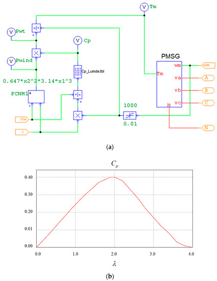 The PMSG wind turbine PSIM model by connecting the constructed PMSG model and the wind turbine modeling in (13)–(15) is shown in Figure 3a, in which a look-up table is like a hill curve shown in Figure 3b. The PMSG wind turbine PSIM model block will be used for the simulation analysis in the following sections.