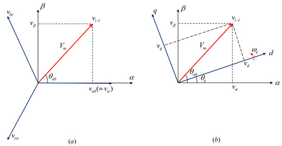 where is the line voltage amplitude, is the angular frequency, is the phase angle, and is the line voltage argument. Figure 5 shows the geometric diagram of the line voltage vector in the stationary α-β frame and synchronously rotating d-q frame with the Clarke and Park transformation given by (17) and (18), respectively.