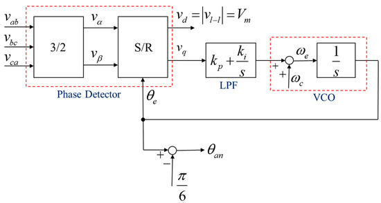 Thus, the S/R block in the phase detector of Figure 6 is functioned as a phase subtracter or a phase comparator. As , is equal to zero. This means the line voltage vector is aligned to the d-axis. To design the PI controller of the phase-locked loop, the transfer-function block diagram can be plotted as shown in Figure 7. The transfer function from the input the output is
