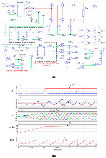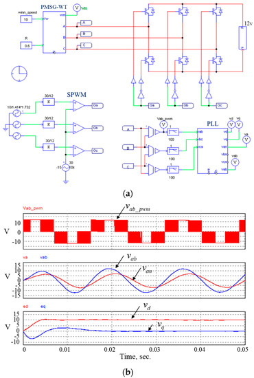 (a) The PLL scheme simulation test in the PWM control of the wind generator; (b) Simulation waveforms.