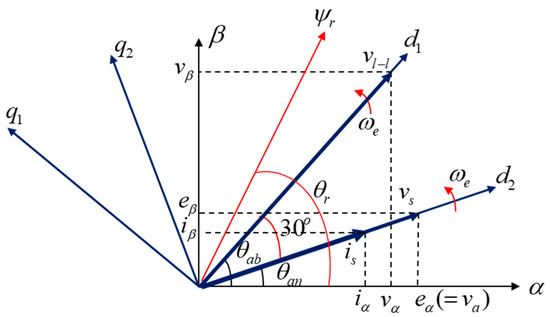 where and are the stator voltage components in the second d-q frame (), which has a phase lag compared to the PLL d-q frame (), as shown in Figure 10. Then, the state equation can be obtained from (35) as