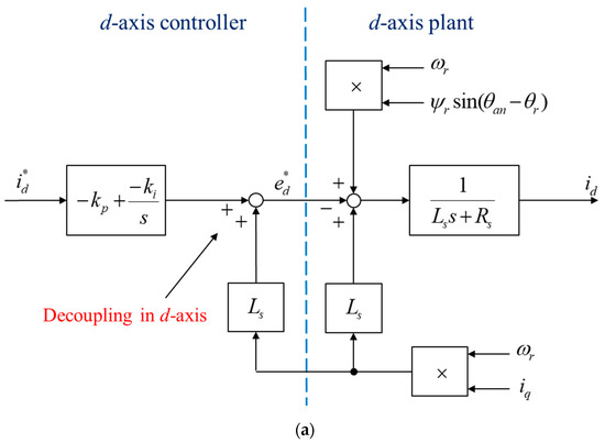 Figure 11 shows the controlled plant and the controller block diagram in the d-axis and q-axis, respectively. As can be seen, the PI controller is followed by a decoupling compensation for eliminating the coupling effect of to on the d-axis plant and to on the q-axis plant, respectively. The term on the d-axis plant and on the q-axis plant can be seen as a disturbance for the controlled current components and , respectively, which can be regulated by the PI controllers.