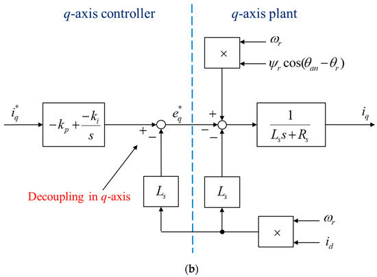 Transfer function block diagram of current decoupling control: (a) d-axis; (b) q-axis.