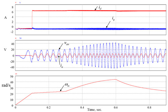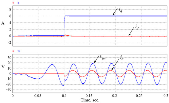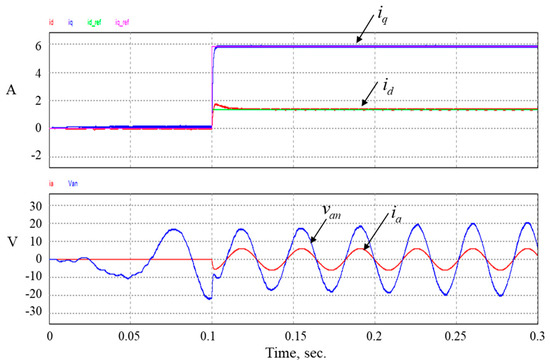 If not using PFC control, the current reference is given on the q-axis with , and the simulation result is shown in Figure 14. As can be seen, is approaching zero and is rising quickly to a constant value equal to (6 A). However, the phase current and the phase voltage are out of phase with phase current leading the phase voltage.