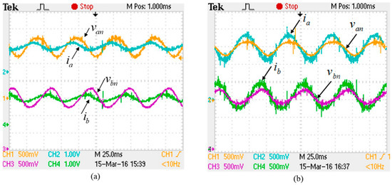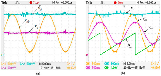 Figure 17 shows experimental waveforms for the PLL scheme. As can be seen from Figure 17a that after the phase is locked, the q-component of the line voltage, , is equal to zero and the d-component, , is kept to be near a constant which is the amplitude of the line voltage. The waveforms of the phase voltage argument, , together with the reconstruction of the phase voltage and the line voltage from the PLL block are shown in Figure 17b. As can be seen, the phase voltage has a phase lag of 30 degrees and about of amplitude compared to the line voltage .