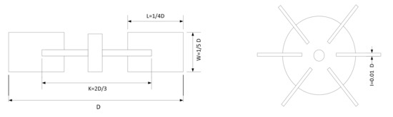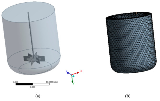 A stirred tank reactor with Rushton turbine was the subject of the modeling. Figure 1 shows the stirred tank reactor geometry and mesh. The selected reactor and impeller dimensions are shown in Table 1. The dimensions are in accordance with the design guidelines for a six-bladed Rushton turbine (RT) impeller disc located at a distance of 0.1 m from the reactor bottom. Figure 2 shows a schematic diagram of the RT impeller-driven stirred tank with dimensions marked on the drawing.