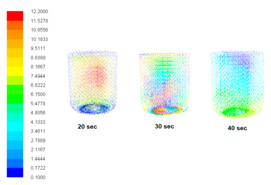 Figure 4 demonstrates the sample flow pattern of velocity vectors of 11.0 vol.% of catalyst solid particles of liquid paraffin oil. It can be observed how slurry concentration was distributed for different time intervals from 20 s to 40 s. Slurry flow field was turbulent. Additionally, an interaction between slurry two phases, i.e., solid particles and paraffin oil, can be seen. Simultaneously, the effects of pressure, temperature, and impeller speed were investigated.