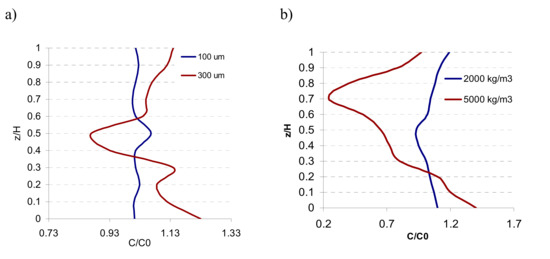 Normalized solid concentration for different values of (a) the catalyst particle size (ds = 100 µm, 300 µm) and (b) bed densities (ρ = 2000, 5000 kg/m3) for dimensionless axial coordinate z/H.