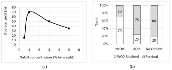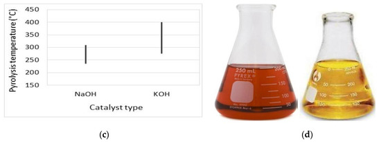 Similar to the investigation conducted in [6] for raw castor oil, both sodium hydroxide (NaOH) and potassium hydroxide (KOH) were used as catalyst for the pyrolysis reaction. A series of tests were first conducted, using NaOH as the catalyst, to show the effect of the catalyst concentration on biodiesel yield, as shown in Figure 3a. It was found that the present of 1% NaOH resulted in the highest biodiesel yield, which is consistent with the previous finding on raw castor oil. However, using WCO as feedstock provided lower yield (70 wt.%) than that of raw castor oil (92 wt.%). Using 1% catalyst concentration as the benchmark, a further comparison of the effectiveness of NaOH and KOH as catalyst is shown in Figure 3b, from which it can be concluded that KOH is much less effective in the current study. This may be partly because the average pyrolysis temperature was lower when using NaOH as catalyst as indicated in Figure 3c, which resulted in lower rate of formation of solid tar residual. The lower pyrolysis temperature range also implied lower overall energy consumption. It is interesting that a different investigation [24] of biodiesel production from used cooking oil via transesterification also indicated that NaOH catalyst delivers the most favourable option in terms of energy consumption. However, because of the higher temperature involved in pyrolysis, the cost of energy consumption will be higher than that of the transesterification process. Figure 3d shows a sample of the filtered WCO before the pyrolysis process (left) and the final biodiesel produced (right).