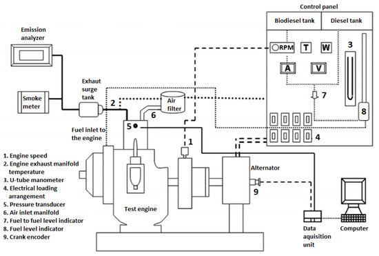 The biodiesel and its blends were subsequently tested in a single cylinder, four strokes, air-cooled, direct injection diesel engine. The engine speed was measured using a speed tachometer. The schematic diagram of the engine test bed is shown in Figure 4 and the technical specifications of the engine are listed in Table 2. The Direct Current (DC) generator was equipped with a load controller (maximum electrical power output of 10.5 kW) and was coupled directly to the engine to measure the brake power. The intake airflow rate was calculated from measuring the pressure drop (via a differential manometer) across a sharp-edged orifice before flowing into the engine. Calibrated K-type thermocouples were used for temperature measurements at different locations on the engine, which includes the intake air and exhaust manifolds. At the beginning of each test, the engine was run for approximately 20 min to reach a steady state before measurements commenced. Subsequently, a fixed amount of fuel (30 cm3) was consumed for each recording period, which then allowed for the average fuel flow rate to be determined. The injection pressure of the fuel was set by adjusting the spring tension of the fuel injector. The instantaneous in-cylinder pressure was measured by a water cooled Kistler piezoelectric pressure transducer (model 601A) coupled with a Nexus charge amplifier (2692-A-0S4). The piezoelectric pressure transducer was flush mounted with the cylinder head to measure the combustion pressure. Flush mounting was preferred to minimize the lag in the pressure signal and to avoid resonance caused by the connecting pipe. The instantaneous position of the piston Top Dead Centre (TDC) was determined using a proximity switch (Type LM12-3004PA), which was fixed on the output shaft of the engine. The combustion pressure data were averaged over 120 consecutive engine cycles. LABVIEW software and national instruments data acquisition card (NI-USB-6210) were used for data acquisition. An OPA 100 smoke meter and MRU DELTA 1600-V gas analyser were used for smoke opacity and exhaust gas emissions concentrations measurements, respectively. The experiment was carried out by varying load from 20% to 100% while maintaining at constant engine speed of 1500 rpm. The overall uncertainty of the experiment was calculated by the following equation by summing the uncertainties in each individual variable (see Table 3):
