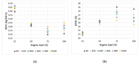 Influence of biodiesel blend ratio and engine load on (a) brake specific fuel consumption (BSFC) and (b) brake thermal efficiency (BTE).