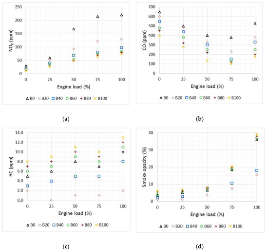Influence of biodiesel blend ratio and engine load on (a) NOx, (b) CO, (c) hydrocarbon (HC) and (d) smoke opacity emissions.