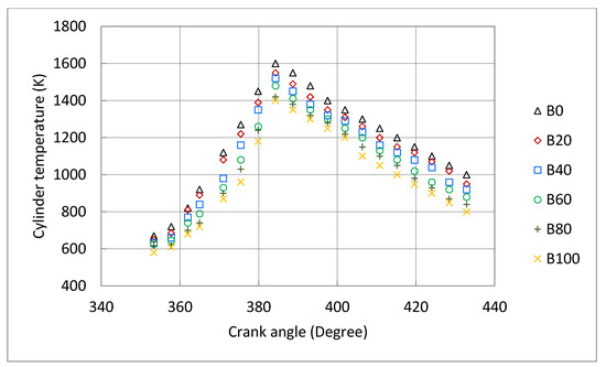 Cylinder temperature for biodiesel blends at different crank angles and full load.