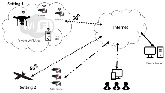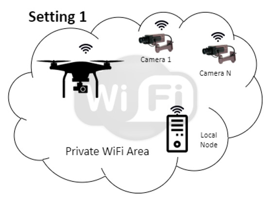 In this scheme, which is the simplest, as can be seen in Figure 2, the processing center and the mission server are in the same node located near the flight area. Communications are covered by the reach of a high-power and high-speed encrypted Wi-Fi network. In this case, the cameras are dedicated and integrated into the monitoring system and accessible via the network. This type of scheme is useful for the following: