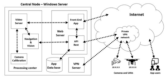 This infrastructure follows a distributed architecture that is supported by a central node and several peripheral nodes, as can be seen in Figure 1. The central node allows for defining flight missions remotely, as well as centralizing the telemetry and video information acquired by the UAVs. It also allows for performing typical management tasks (users, flight zones, UAVs, and cameras registration, etc.), statistics, and accounting. Regarding the peripheral nodes, they can be of two types:
