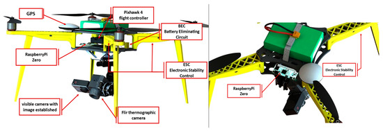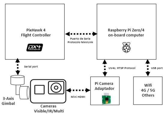 - A second processing unit based on Raspberry Pi Zero W that serves as a gateway for telemetry and video via a mobile network connection through the Huawei E3372 4G USB Modem. In Figure 5, some of the electronic components embedded in the UAV can be seen.