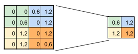 After filtering, a feature mapping of the entire image is obtained with the most striking characteristics. These are represented by scores for each pixel in each kernel. Before performing a new convolution, a process called subsampling is performed, where the image is reduced in each operation so as not to exponentially increase the computational cost. For example, for a 4 × 4 matrix, it is simplified using the max-pooling method, as can be seen in Figure 13: