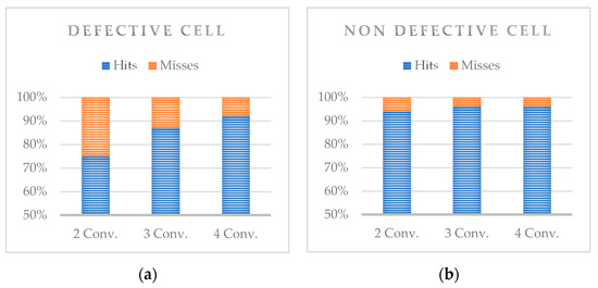 Once the detection process is finished, the classification process begins. For this case study, the pretrained classifier detected the defective panels with an accuracy of 92% and the panels without defect with 96% as can be seen in Figure 14. It has been determined that a fourth convolution is necessary for more accurate results. Although the accuracy of detection of non-defective panels was high with the third convolution, it was not enough in the case of defective panels and it needed a fourth convolution.