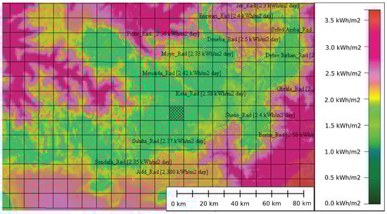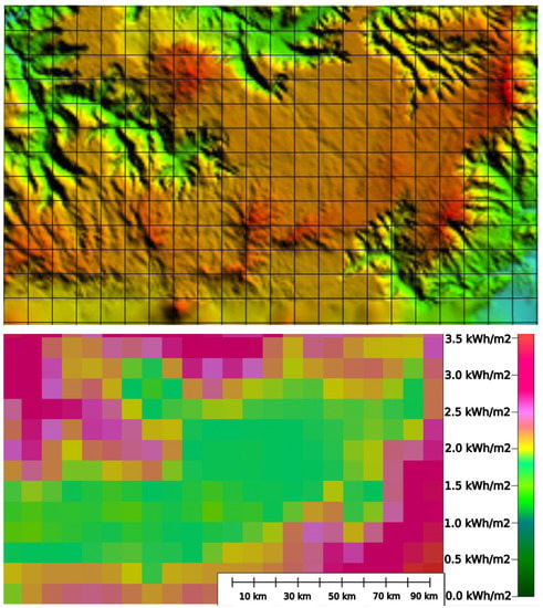 In order to illustrate the proposed method, a study case is presented for the Amhara region in North Shewa, Ethiopia. As input, publicly available long-term data of GHI is used from SWERA project [] having a coarse resolution of 10 km × 10 km ( cell size). Further, a high-resolution DEM was obtained from GeoCommunity™ website []. In Figure 1 geo-referenced maps of elevation (above) and irradiation (below) are shown for the studied Amhara region.
