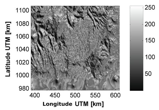 A continuous raster of the terrain aspect was created in order to facilitate data sampling (see Section 3.2. This was attained using the built-in shader function for slope direction of the GIS platform of Global Mapper software []. In order to obtain useful data, the default grayscale has been adapted. As a simplification of more complex natural phenomena, it is assumed that east and west orientation have the same effect on radiation. Therefore, the scale is defined ranging from 0 (black = north) to 255 (white = south). West and east are equally represented by the value 127 (gray). As a result, a circular scaling is obtained. From the GIS data an average aspect value is calculated for each square kilometer of the region extension. The resulting map is shown in Figure 2.
