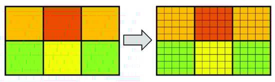 Therefore, in a first step, the resolution of solar data is increased to 1 km × 1 km, such as the terrain layers (see Figure 3). Notice that in this step, only the number of data points is increased and no information is added. This step is merely for convenience for the following steps, as all four matrices M (one for solar radiation and three for terrain properties) have the same size and each cell is geo-referenced to the same location.