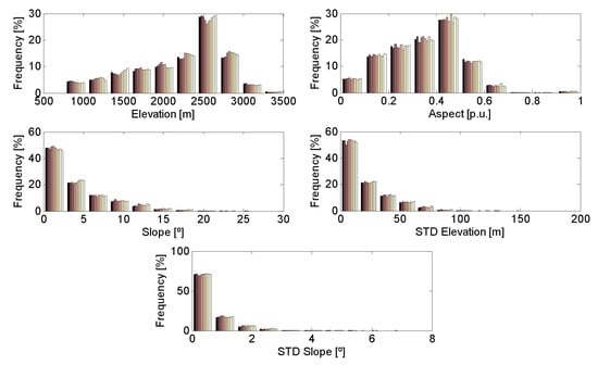 It can be expected that any of these sets are suitable as training set. In order to verify if the obtained reduced datasets are representative for the original data and to select the best training set, two additional steps are proposed here. Notice that the representativeness for solar radiation data is given automatically, as exactly one line (ten identical values) is extracted from each cell of 10 km × 10 km. First, histograms are computed for all reduced matrices of terrain data. An example is given in Figure 4, where the histograms of the ten possible training sets for terrain elevation, slope, aspect as well as for the STD of elevation and aspect are shown.