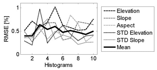 The results for all five terrain variables are shown in Figure 5. The numbering of the histograms is related to the first line i of extraction. In addition, the average of all 5 curves is shown. From this average, it can be derived that the most representative training sets would be those with index 1, 2 and 9. Nevertheless, it can also be concluded that any training set is suitable, as all sets have distributions which are very similar to each other, with deviations of less than 1%.