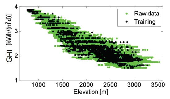 In order to illustrate the obtained training data set, in Figure 6, a cross-correlation plot of available data and the extracted training data for radiation and elevation is shown. The strong correlation of these two parameters can be observed easily.
