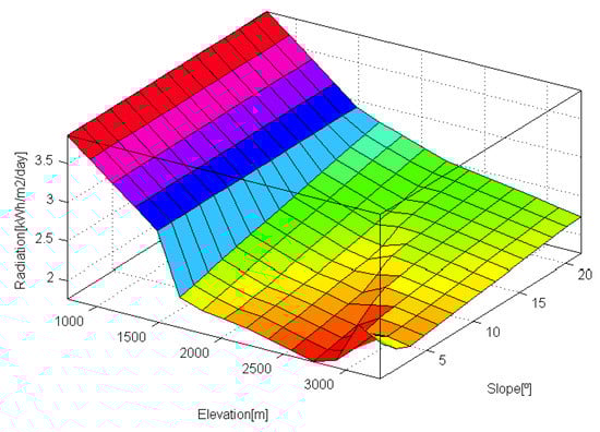 Some authors introduce the terrain conditions to improve the calculation of the solar radiation received in a certain area [,,,]. On flat terrain with clear-sky, solar radiation is almost the same over relatively large areas []. In hilly and mountainous terrains, altitude and slope distribution has a greater effect on local climate []. Surface radiation can change a lot depending on the frequency and thickness of the clouds []. As a result, terrain parameters such as elevation are related to solar radiation because they have a direct impact on cloud covers.