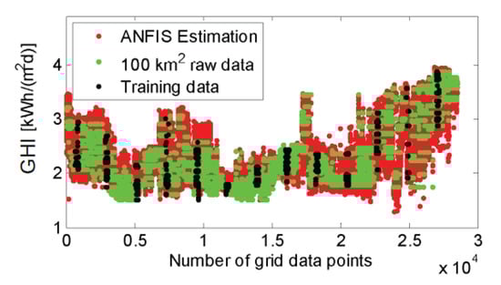 In Figure 9, the effect of the modification of solar radiation data can be observed. Raw data (coarse radiation) is compared with ANFIS estimation for every 1 km × 1 km grid cell. The graph represents a sequential scan of the map from the upper left corner down to the lower right corner. On the horizontal axis all the pixels of the map are represented in order. Training data is represented at the same position as raw data. Therefore, training data (black dots) is separated into 13 almost vertical lines which represent the 13 rows of the coarse radiation data set. This way it can be seen how three-dimensional data has been represented in a two-dimensional plot. It can be observed how minimum and maximum radiation limits are widely respected and much more intermediate values are generated. In addition, it can be seen how few training data values of solar radiation were employed.