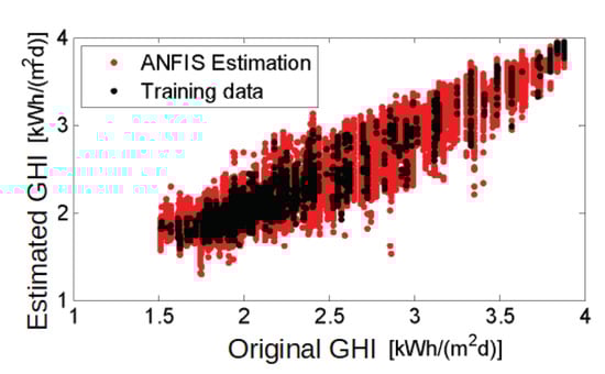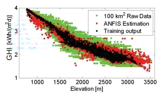 Therefore, the present methodology combines topographic data with geo-referenced GHI values. Geo-statistical information is captured from GHI data available in lower resolution (e.g., cell size of 10 km × 10 km) using ANFIS to estimate data with higher resolution (e.g., 1 km × 1 km).
