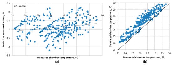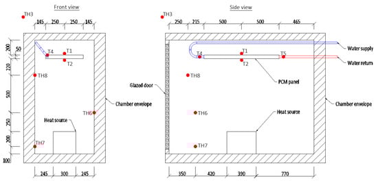 The heat loss coefficient was indirectly measured by inserting a heat source with a known heating capacity of 90.1 W inside the chamber, and the temperatures inside and outside of the chamber were measured. When a thermal equilibrium was reached (Figure 2) the heat loss coefficient (W/K) of the chamber was calculated using the temperature difference between the inside and outside of the chamber and the power of the heat source (refer to Equation (1)). The calculated heat loss coefficient of the chamber was Ht = 8.06 W/K.