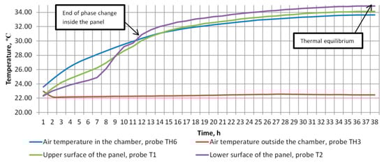 It is important to note that, during the measurement of Ht value, the upper and lower surfaces had a different temperature trend (Figure 2). This can be explained by the fact that the panel is only 80% filled with PCM. In the lower surface, the PCM has a direct contact with the panel wall; however, in the upper part of the panel there is an air gap between the steel wall and the PCM that reduces heat transfer. The small temperature differences between chamber temperature, upper surface, and lower surface temperatures after thermal equilibrium is reached can be attributed to measurement error, thermal stratification, and local effects due to the sensor placement.
